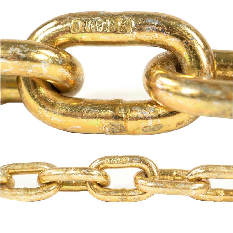 এই চেইনটি উচ্চ-শক্তি, কম-মিশ্র ধাতুযুক্ত কার্বন ইস্পাত ব্যবহার করে তৈরি করা হয়েছে এবং ক্ষয় সুরক্ষা এবং গ্রেড 70 টাই ডাউন চেইন হিসাবে দ্রুত সনাক্তকরণের জন্য একটি হলুদ জিঙ্ক ক্রোমেট ফিনিস দিয়ে প্রলিপ্ত করা হয়েছে। উচ্চ মানের, স্ট্যান্ডার্ড লিঙ্ক 5/16" আকারের চেইনটি উচ্চতর মানের জন্য তাপ-চিকিত্সা এবং শক্তি-পরীক্ষিত।